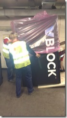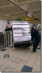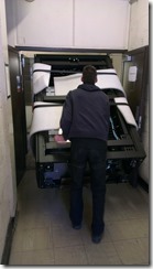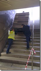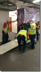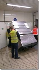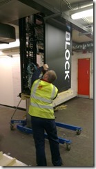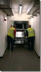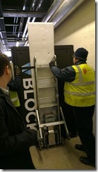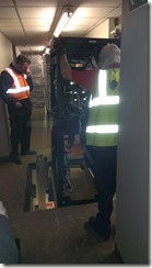 Datecenter B was a lot more difficult. The Vblocks had to be delivered down two flights of stairs, across a ticketing concourse and through into a fire escape and then dropped down through a ceiling void into the datacenter all whilst the general public were still utilizing the area. A custom lift had to be designed to lower the Vblocks and pretty much all hardware had to be removed including the cabinet doors and hinges and there was literally millimetres left to play with. Below are some images taken of the delivery for datacentre B: